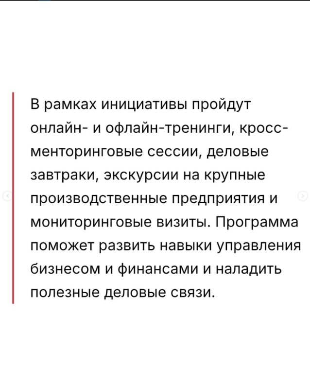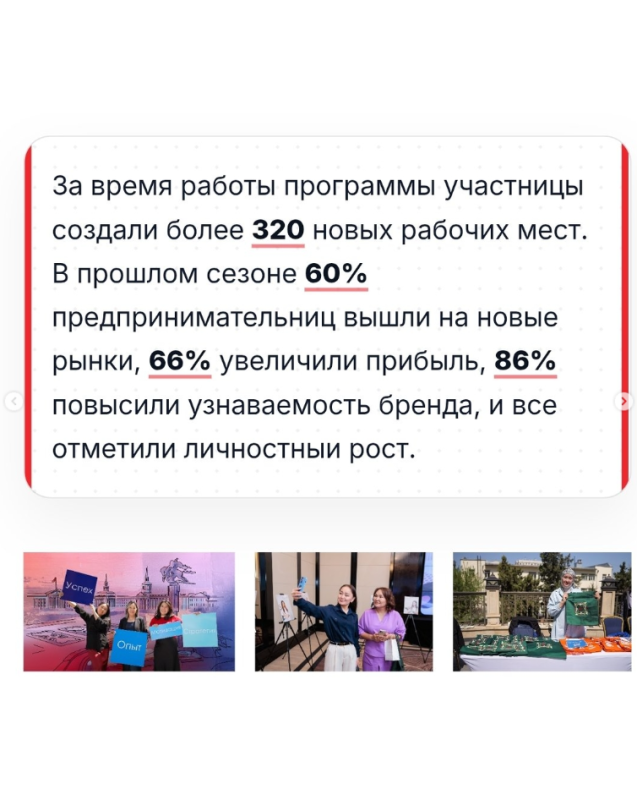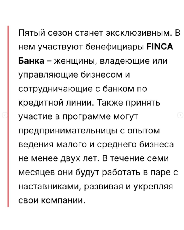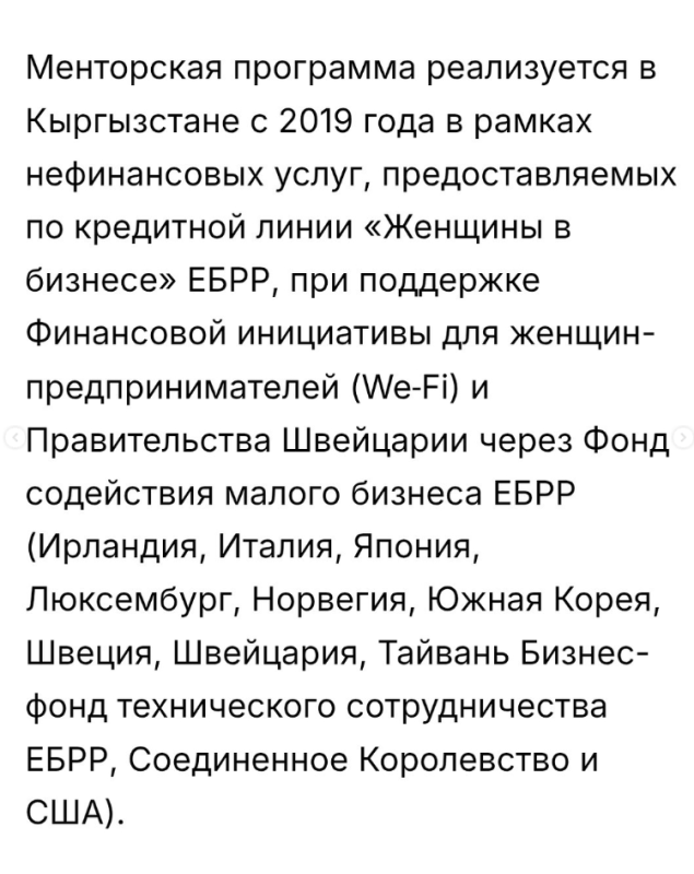 — В Кыргызстане стартовал прием заявок на участие в пятом, юбилейном, сезоне менторской программы «Женщины в бизнесе», реализуемой Европейским банком реконструкции и развития (ЕБРР) совместно с FINCA Банком. Программа направлена на поддержку женского предпринимательства и усиление роли женщин-лидеров в экономике.