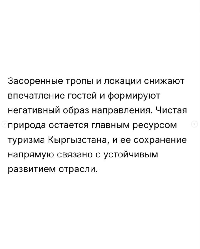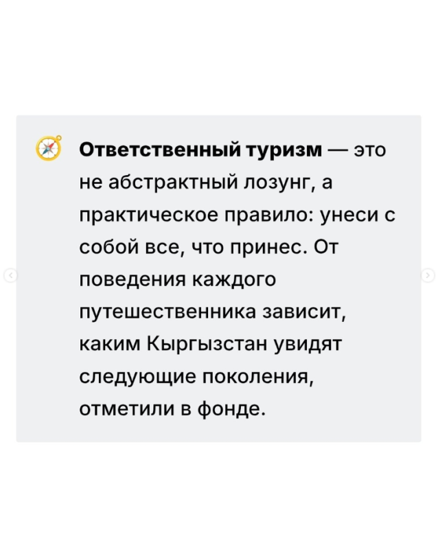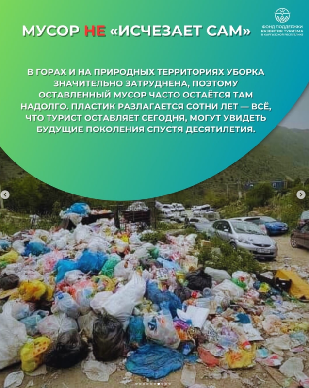 — В горах и на природных территориях Кыргызстана мусор не исчезает сам по себе — он остается там на годы и десятилетия, нанося ущерб экосистемам и репутации страны как туристического направления. Фонд поддержки развития туризма напомнил путешественникам: нужно бережно относиться к природе и не оставлять отходы после отдыха.