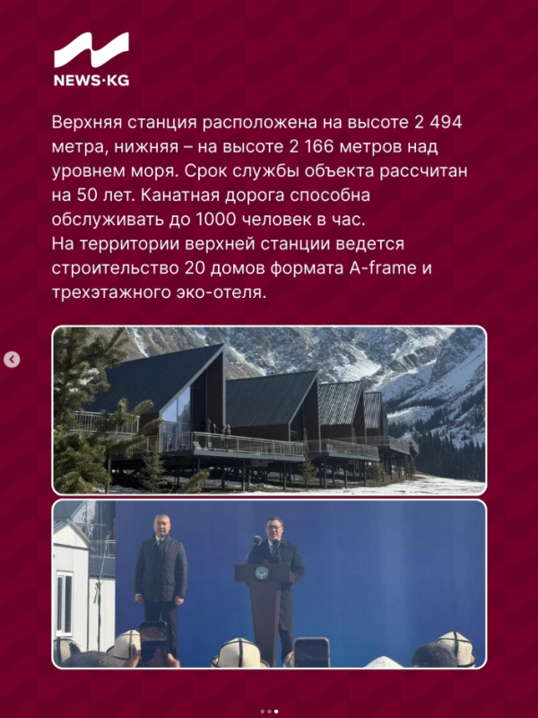 В государственном природном парке «Ала-Арча» открыли новую канатную дорогу длиной 1 км с 16 кабинками, включая две VIP, способную перевозить до 1000 человек в час.