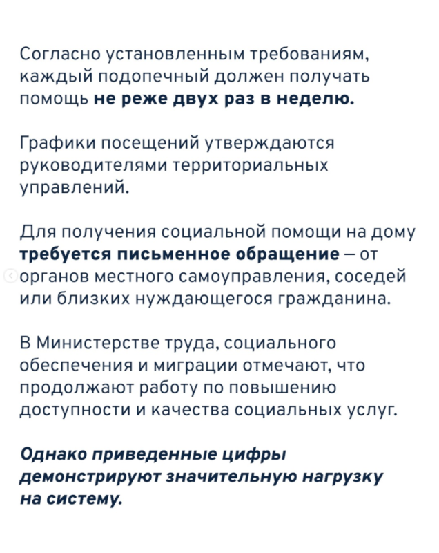 В Министерстве труда, социального обеспечения и миграции отмечают, что продолжают работу по повышению доступности и качества социальных услуг. Однако приведенные цифры демонстрируют значительную нагрузку на систему.