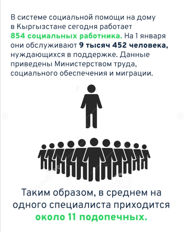 В системе социальной помощи на дому в Кыргызстане сегодня работает 854 социальных работника. На 1 января они обслуживают 9 тысяч 452 человека, нуждающихся в поддержке. Данные приведены Министерством труда, социального обеспечения и миграции.
