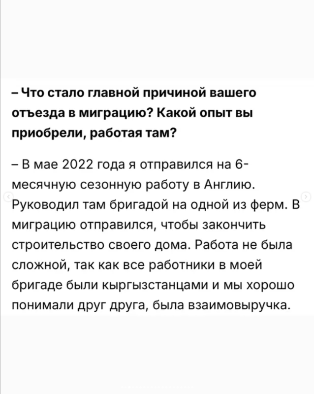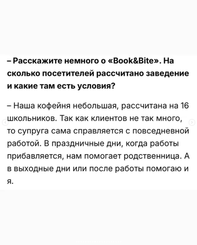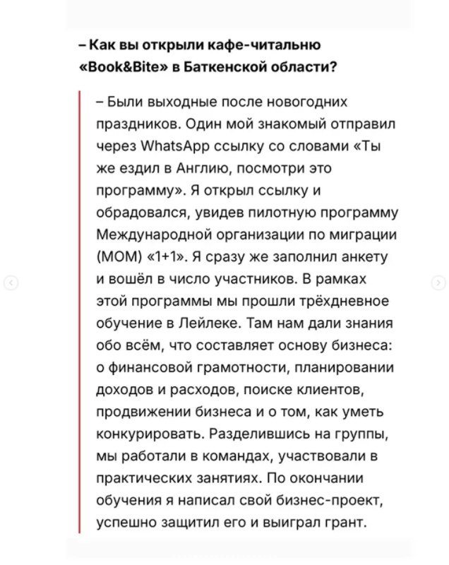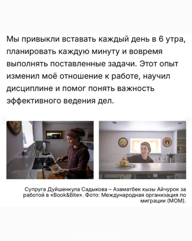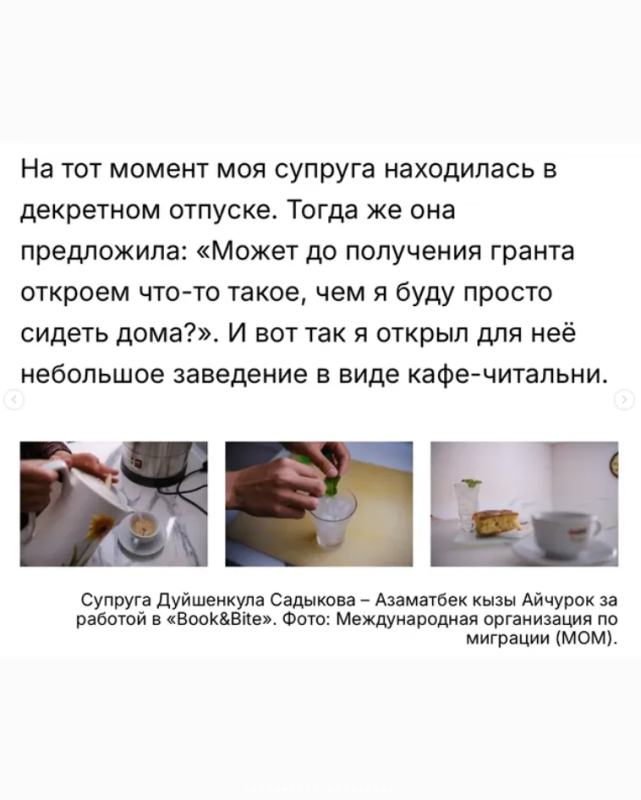 — Наш очередной герой — житель села Пульгон Баткенской области Дуйшенкул Садыков. Он, как и многие другие, съездил на сезонные работы в Англию, чтобы завершить строительство дома. Затем он стал участником пилотной программы «1+1» Международной организации по миграции (МОМ) @iomkyrgyzstan и выиграл грант. Этот грант позволил Дуйшенкулу и его супруге осуществить давнюю мечту — открыть кафе-читальню «Book&Bite».