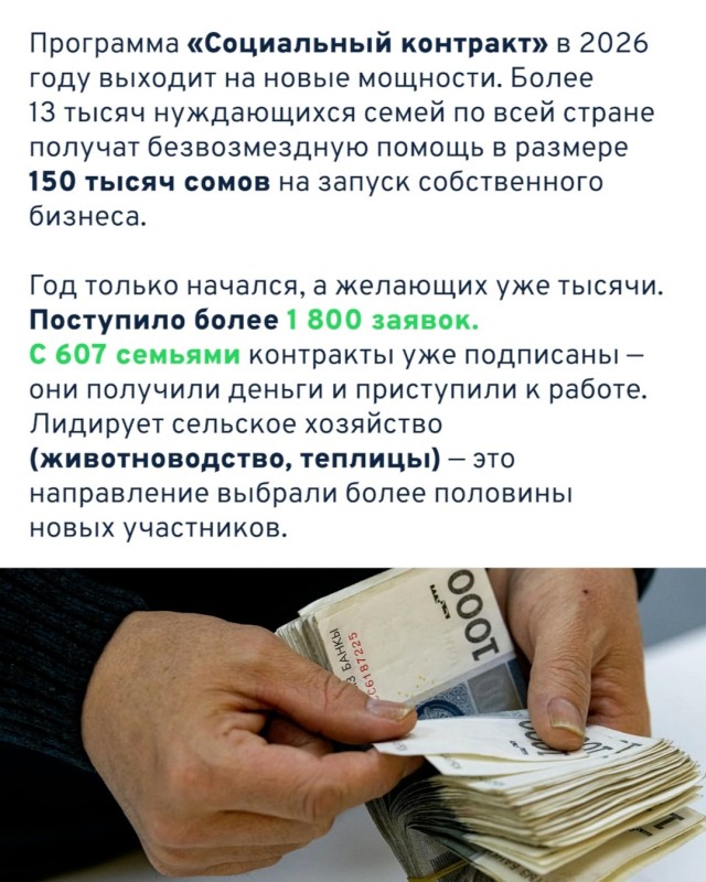 Программа «Социальный контракт» в 2026 году выходит на новые мощности. Более 13 тысяч нуждающихся семей по всей стране получат безвозмездную помощь в размере 150 тысяч сомов на запуск собственного дела.