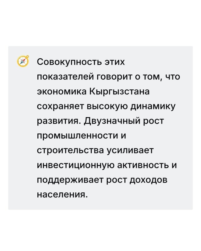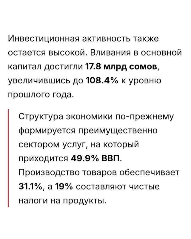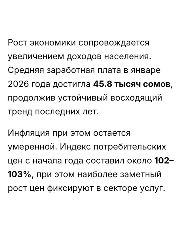 — Экономика Кыргызстана начала год с заметного ускорения. Промышленность, строительство и инвестиции демонстрируют двузначные темпы роста, что поддерживает общую деловую активность в стране. Такие данные озвучили на презентации итогов социально-экономического положения КР за январь–февраль 2026 года.