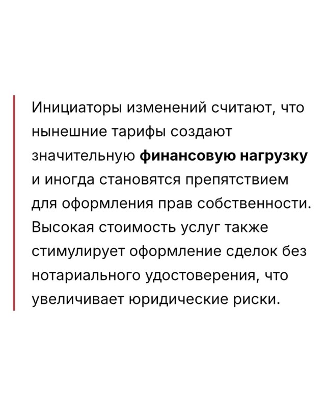 Изменения касаются постановления правительства от 15 апреля 2019 года № 159, которое регулирует размеры государственной пошлины за нотариальные действия. Авторы инициативы предлагают привести ставки к уровню тех сборов, которые уже действуют при регистрации сделок с недвижимостью без нотариального удостоверения.
