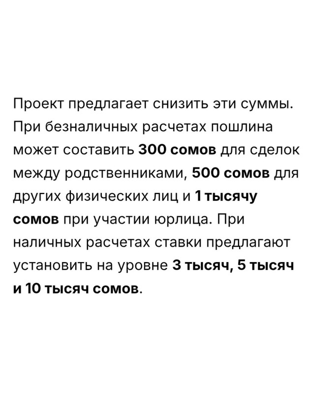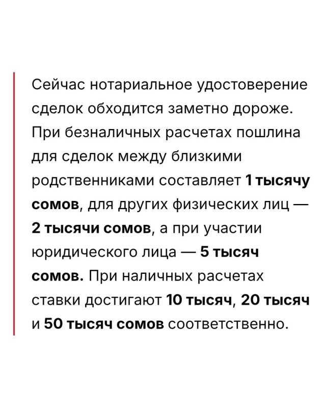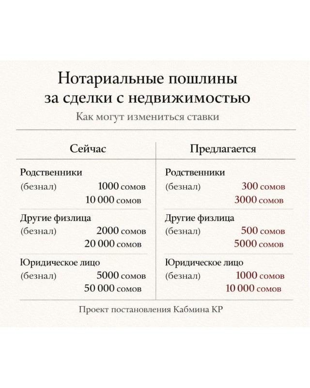 — В Кыргызстане предложили значительно снизить госпошлины за нотариальное удостоверение сделок с недвижимостью. Проект постановления кабмина вынесен на общественное обсуждение и предполагает пересмотр действующих ставок, которые сегодня считают слишком высокими для многих граждан.