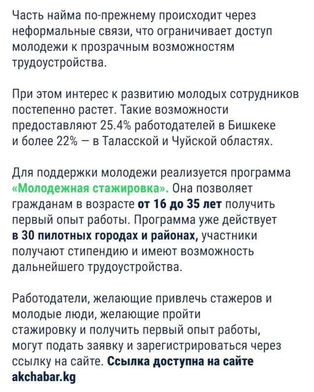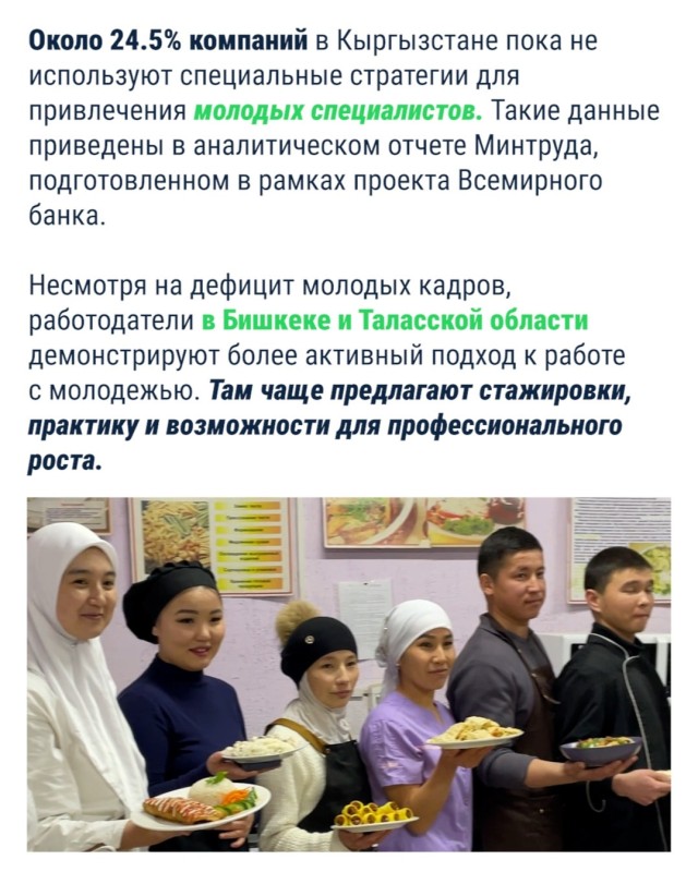 Несмотря на дефицит молодых кадров, работодатели в Бишкеке и Таласской области демонстрируют более активный подход к работе с молодежью. Там чаще предлагают стажировки, практику и возможности для профессионального роста.
