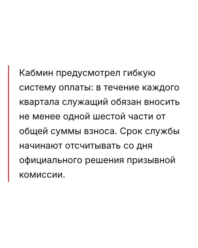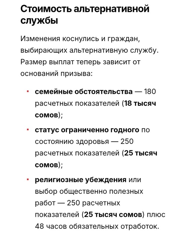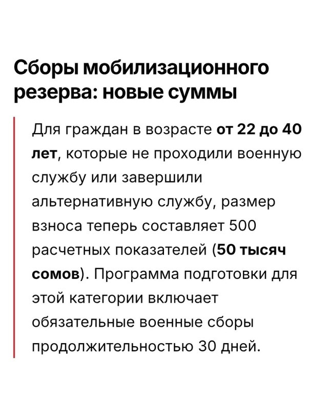 -; Кабинет министров Кыргызстана утвердил новые правила призыва на альтернативную службу и прохождения сборов мобилизационного резерва. Постановление № 191 от 25 марта 2026 года корректирует размеры денежных взносов для граждан.
