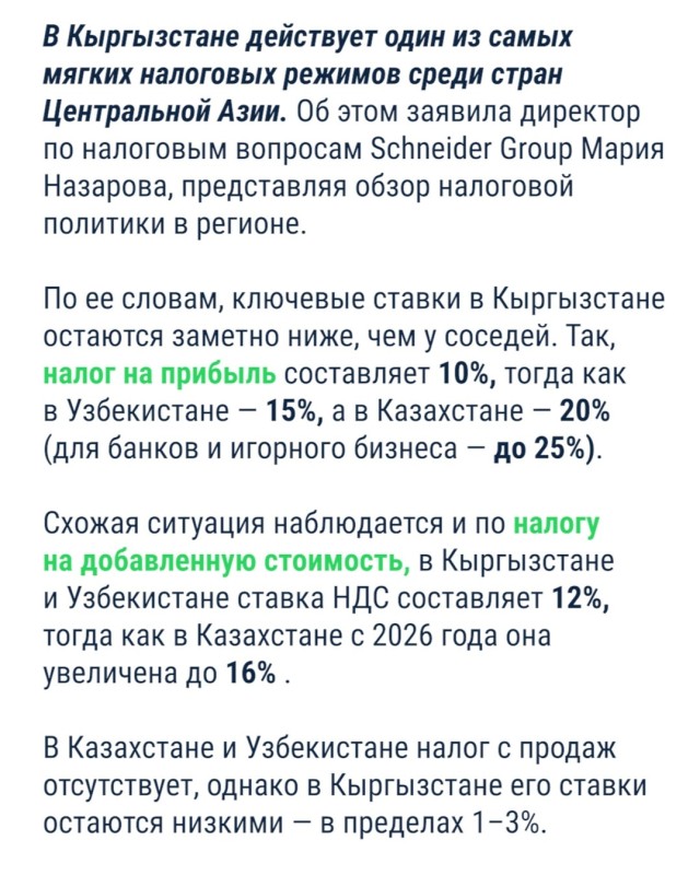 По ее словам, ключевые ставки в Кыргызстане остаются заметно ниже, чем у соседей. Так, налог на прибыль составляет 10%, тогда как в Узбекистане — 15%, а в Казахстане — 20% (для банков и игорного бизнеса — до 25%).