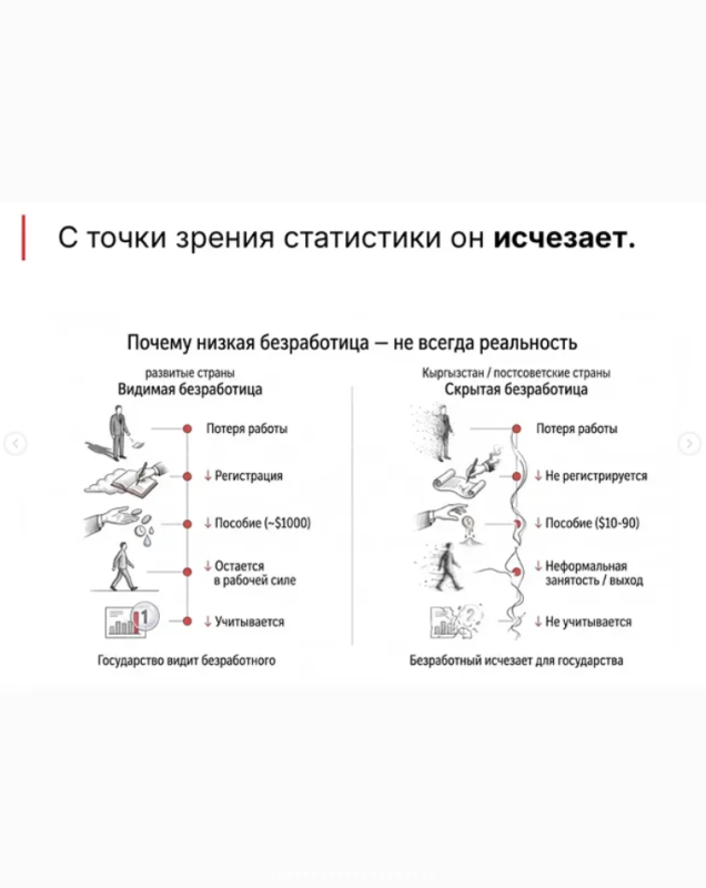 — Редакция Economist.kg регулярно пишет о рынке труда, заработных платах и занятости. Зачастую официальная статистика выглядит парадоксально и расходится с реальной картиной мира. Один из таких феноменов — низкий уровень безработицы, характерный для многих постсоветских стран.