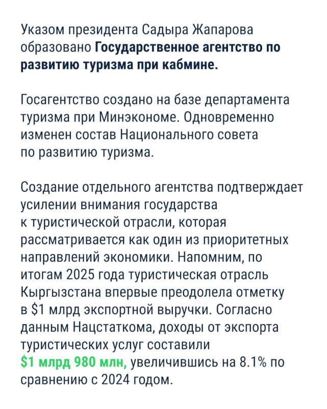 Создание отдельного агентства подтверждает усилении внимания государства к туристической отрасли, которая рассматривается как один из приоритетных направлений экономики. Напомним, по итогам 2025 года туристическая отрасль Кыргызстана впервые преодолела отметку в $1 млрд экспортной выручки. Согласно данным Нацстаткома, доходы от экспорта туристических услуг составили $1 млрд 980 млн, увеличившись на 8.1% по сравнению с 2024 годом.