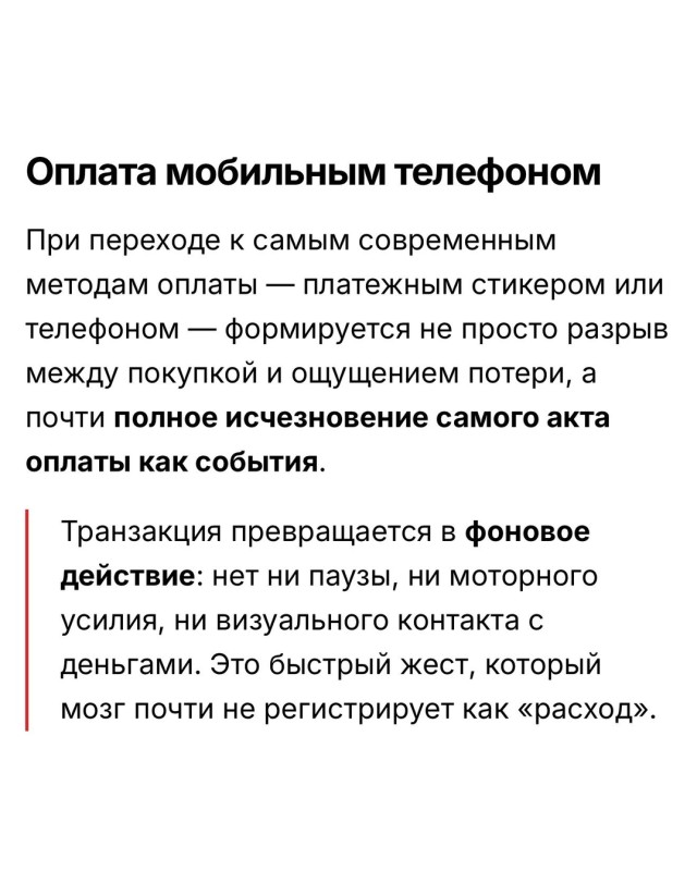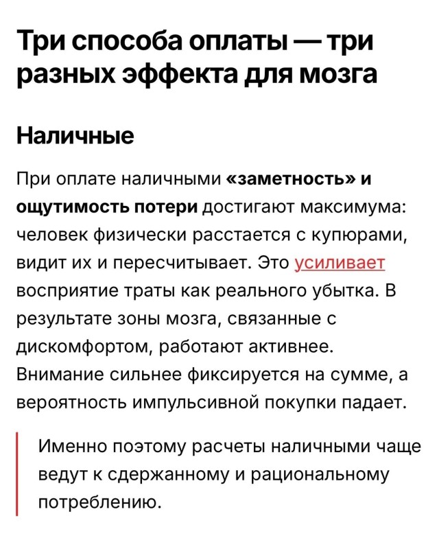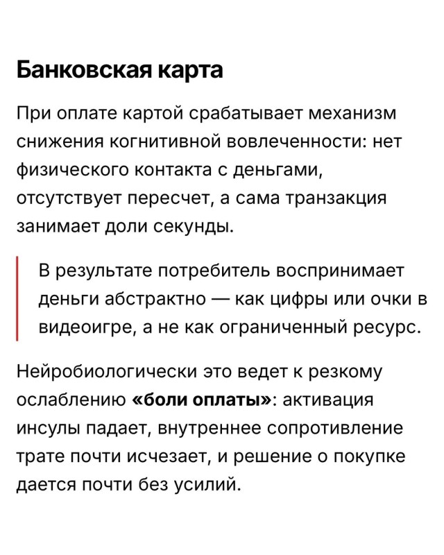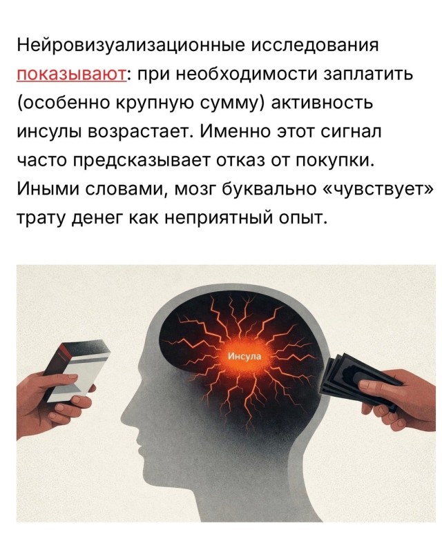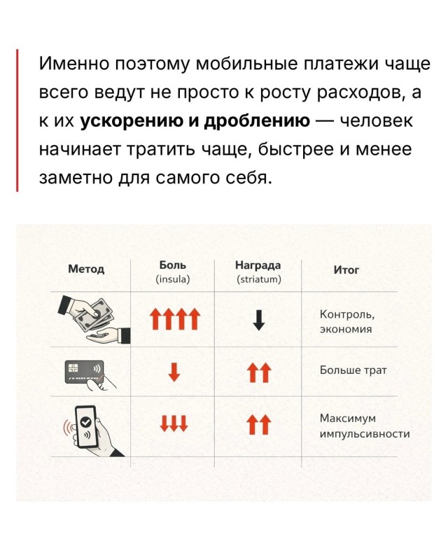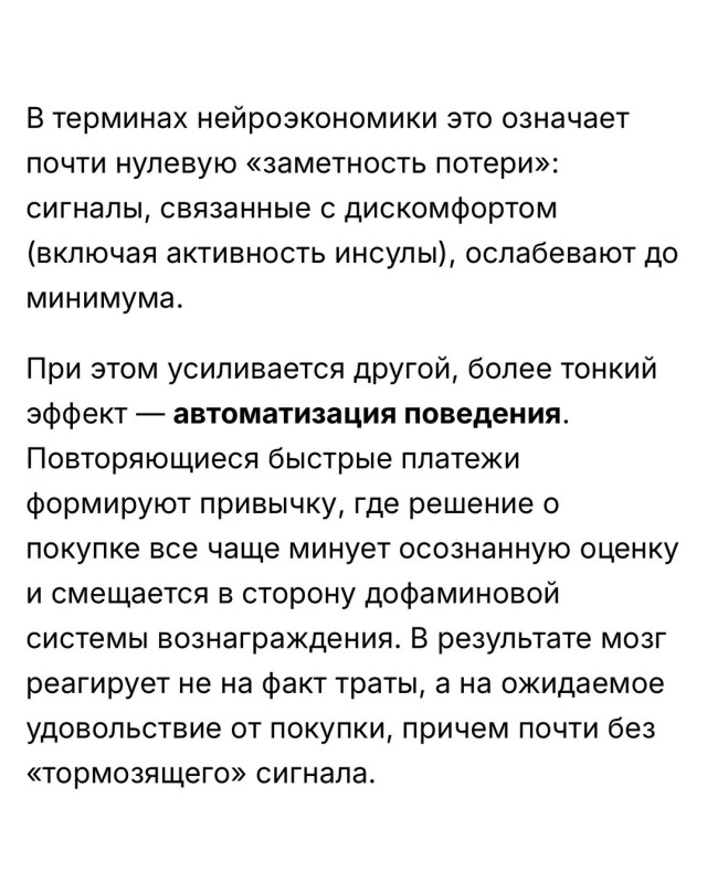 Нейроэкономические исследования показывают: при безналичной оплате мозг слабее фиксирует «боль потери». Чем проще и незаметнее транзакция, тем ниже активация зон, отвечающих за дискомфорт, и тем выше готовность тратить.