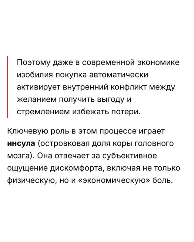 Когда мы совершаем покупку, мозг воспринимает это не просто как обмен денег на товар, а как потенциальную потерю ресурса. Это связано с тем, что значительная часть нейронных механизмов принятия решений формировалась в условиях дефицита: для систем выживания, которые помогали людям в старые времена бороться с агрессивной внешней средой, любое уменьшение запасов (еды, энергии, эквивалентов «ценности») требовало осторожности.