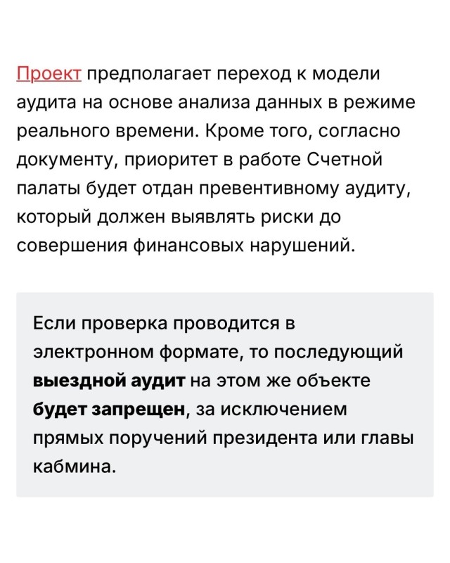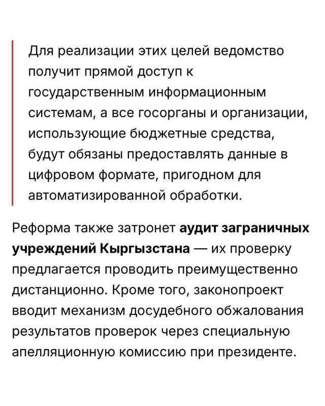 — Счетная палата Кыргызстана планирует реже отправлять аудиторов на объекты, заменив личные визиты удаленным электронным контролем. Соответствующий проект конституционного закона разработан Минюстом и выставлен на общественное обсуждение.