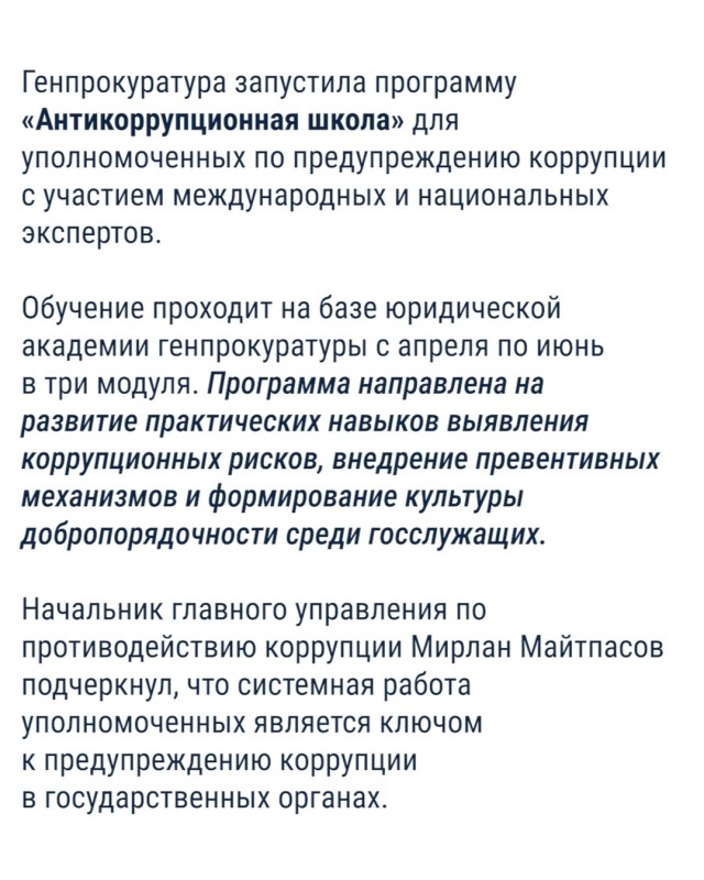 Обучение проходит на базе юридической академии генпрокуратуры с апреля по июнь в три модуля. Программа направлена на развитие практических навыков выявления коррупционных рисков, внедрение превентивных механизмов и формирование культуры добропорядочности среди госслужащих.