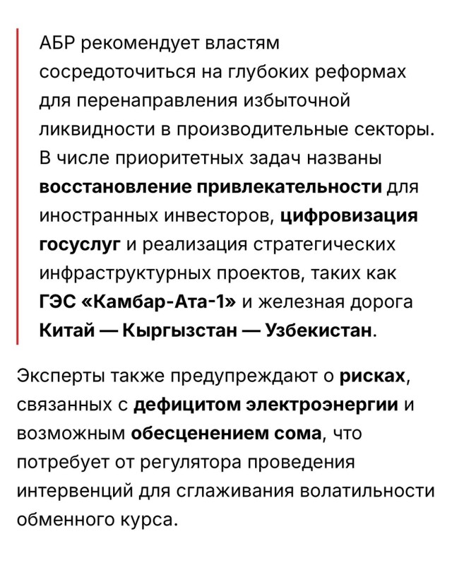 Согласно апрельскому «Обзору развития Азии» АБР, накопленная избыточная ликвидность ограничивает возможности Национального банка по управлению направлением кредитов, из-за чего средства не поступают в реальный сектор экономики.