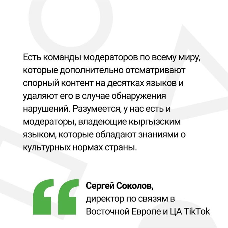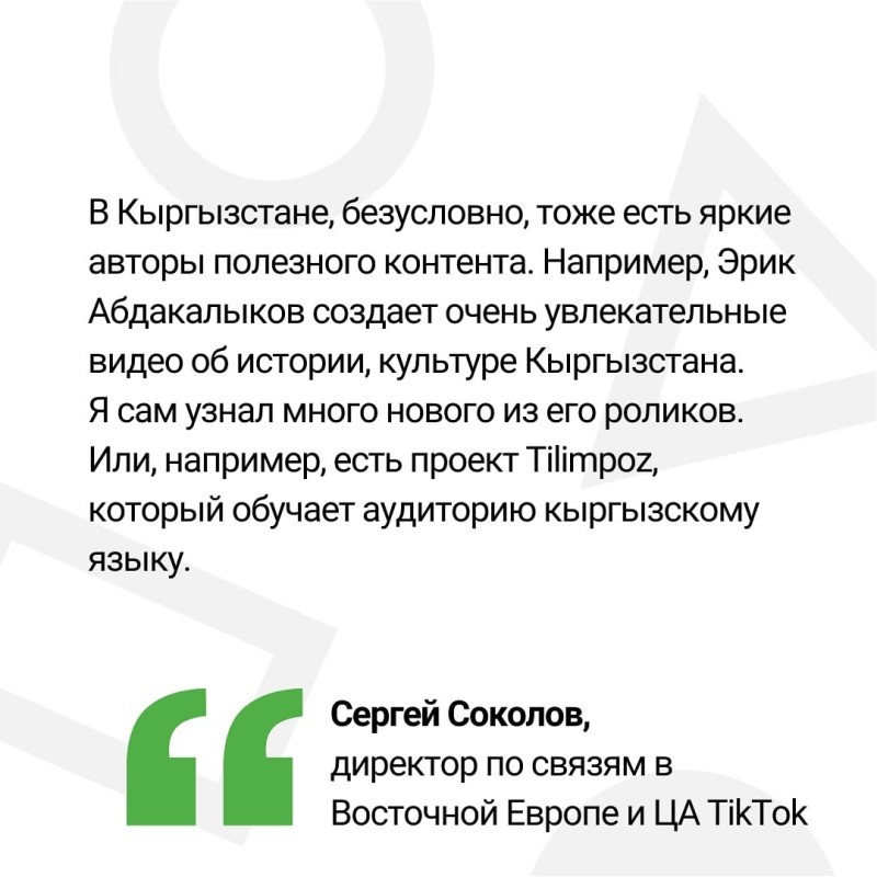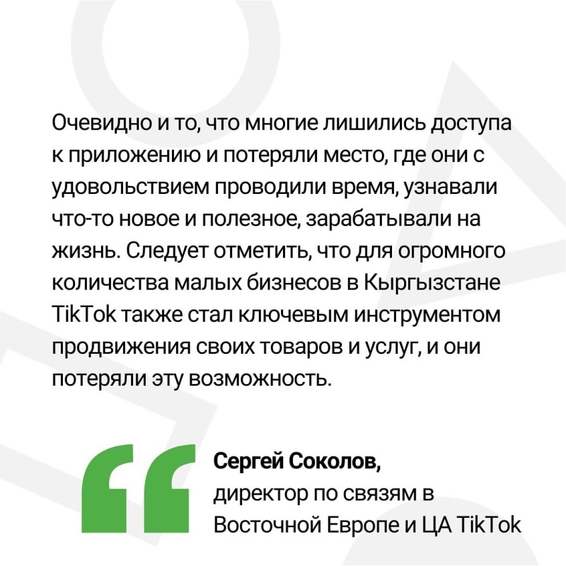 Директор по связям с органами власти и корпоративным вопросам в Восточной Европе и Центральной Азии TikTok Сергей Соколов рассказал Kaktus.media о влиянии блокировки соцсети в Кыргызстане и о том, что предпринимает платформа.
