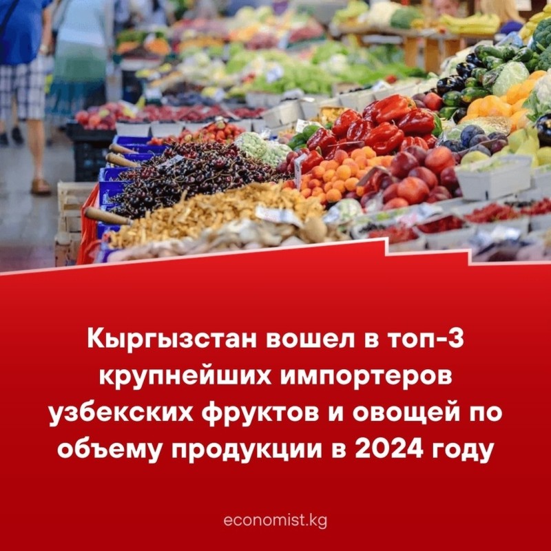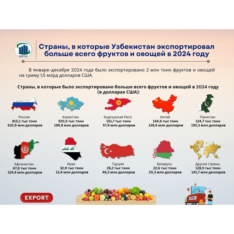 В 2024 году Узбекистан экспортировал 2 млн тонн фруктов и овощей на сумму $1.5 млрд. В топ-3 стран, куда РУз поставляла данную категорию продуктов, вошли Россия, Казахстан и Кыргызстан.