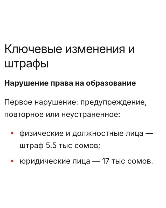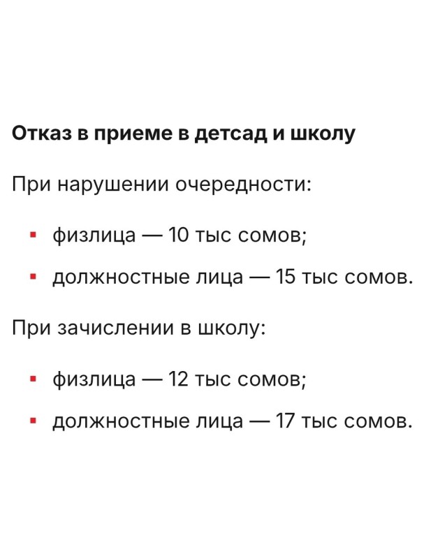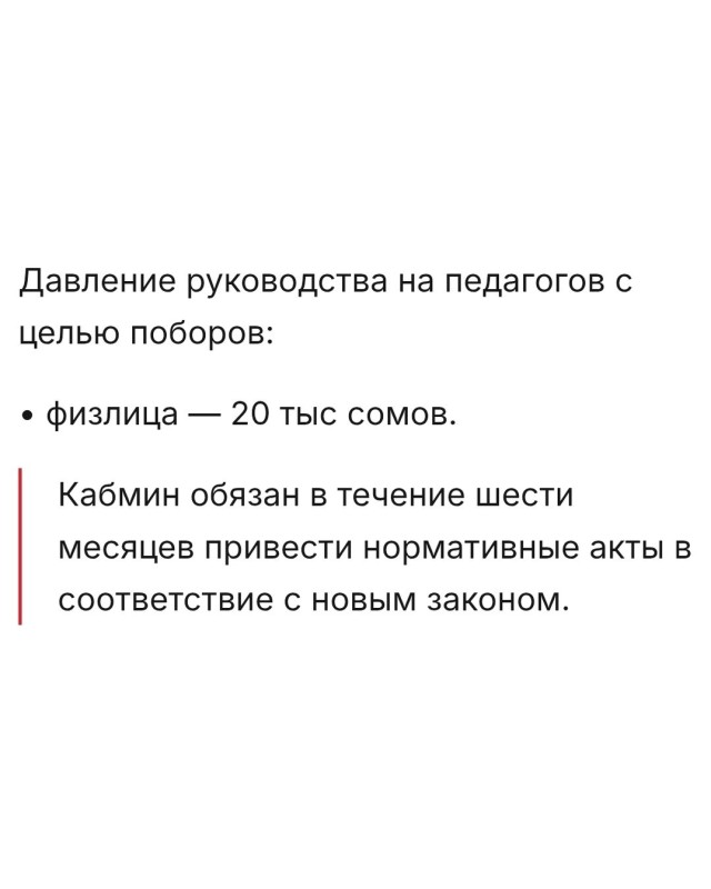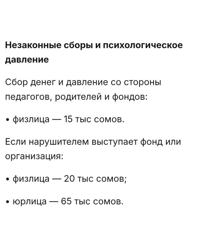 — Президент КР Садыр Жапаров подписал закон о внесении изменений в Кодекс о правонарушениях, направленных на защиту прав обучающихся и борьбу с незаконным сбором средств в школах и детсадах. Документ принят Жогорку Кенешем 30 апреля и вступит в силу через шесть месяцев после публикации — с декабря 2025 года.