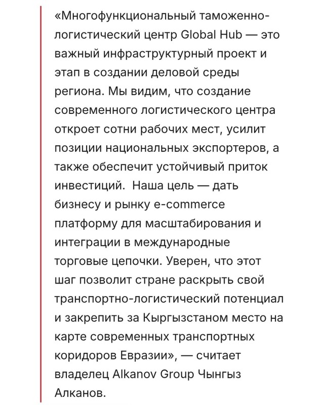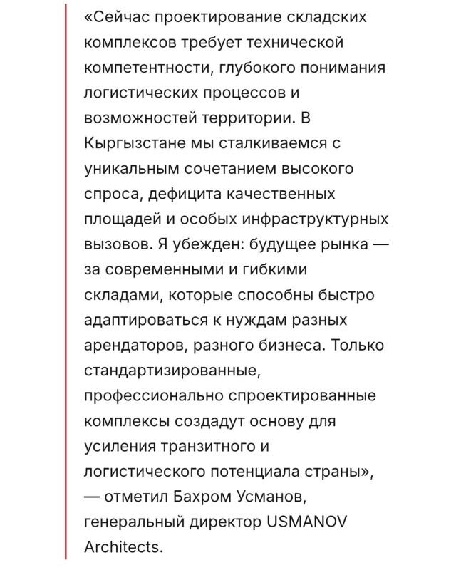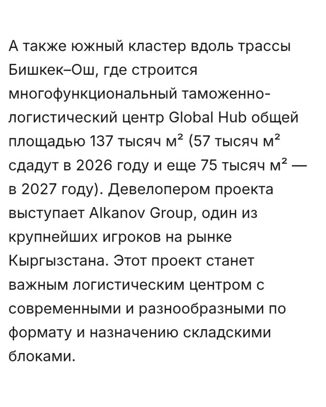 «Сейчас рынок складской недвижимости Кыргызстана находится на старте масштабных перемен: острый дефицит помещений и высокий спрос становятся катализаторами новых инвестиций в качественные проекты. Мы убеждены, что развитие новых логистических хабов создаст реальные возможности для модернизации сферы хранения и логистики в республике и станет драйвером роста экономики», — комментирует Станислав Ахмедзянов, управляющий партнер IBC Global.