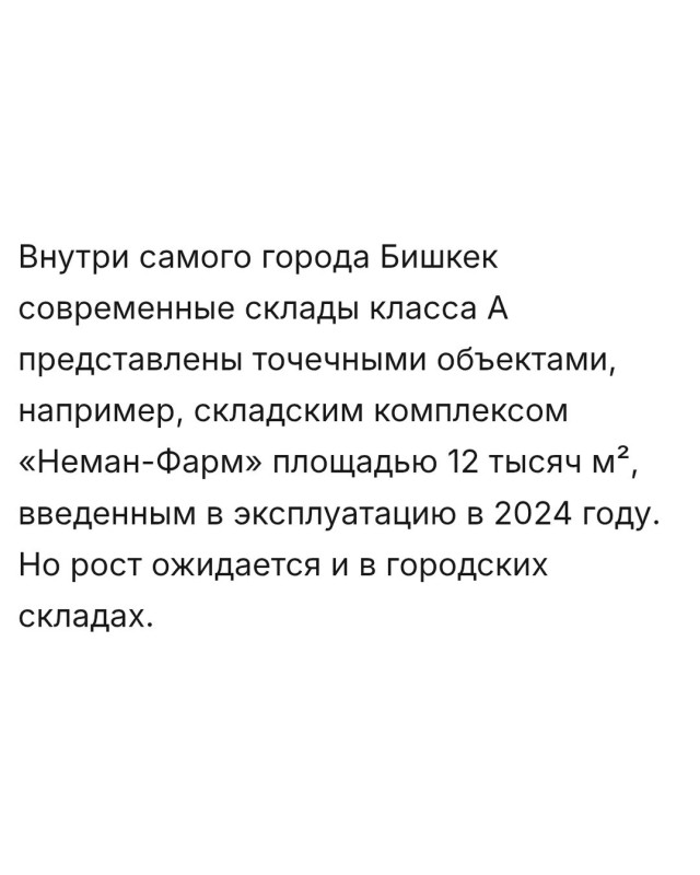 — По данным международной консалтинговой компании IBC Global, рынок складской недвижимости Кыргызстана готовится к масштабному росту: к концу 2025 года общий объем качественных складов классов A и B увеличится со 108 тыс м² до 400 тысяч м², достигнет около 0.55 млн м² к концу 2026 года и превысит 1.3 млн м² в 2027–2028 годах.