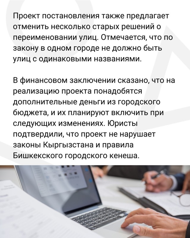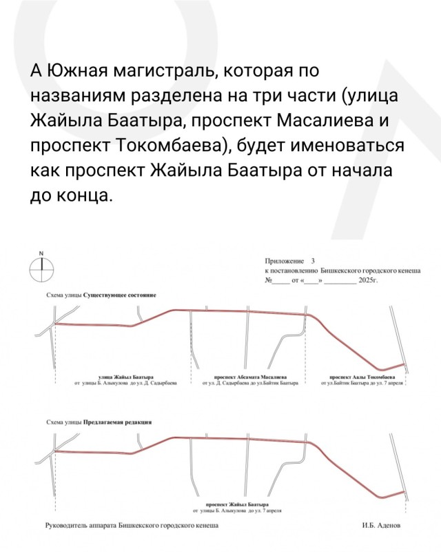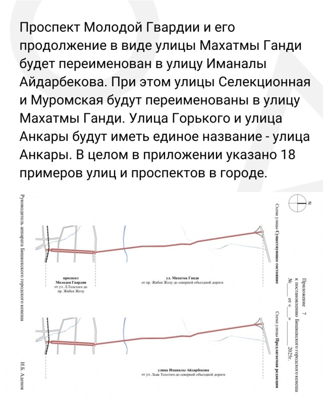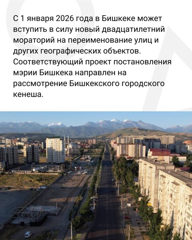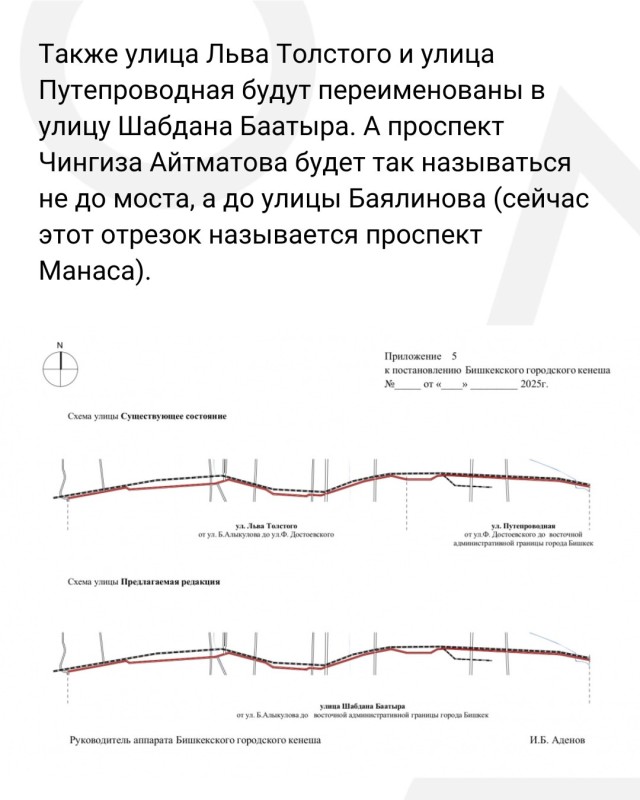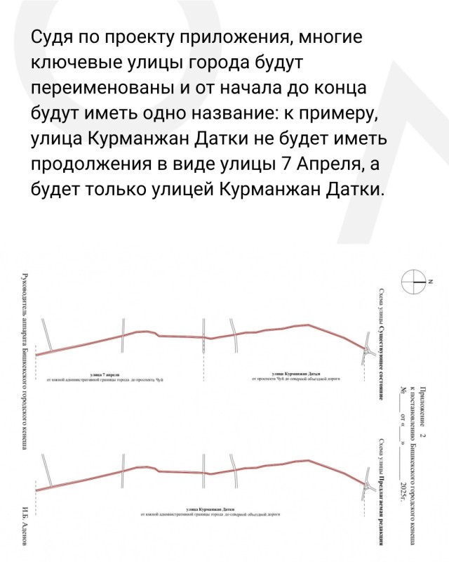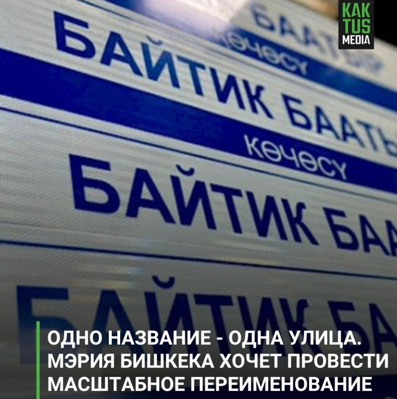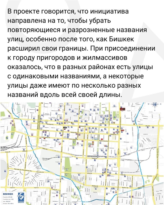 Власти Бишкека предложили объединить разрозненные участки улиц под едиными названиями, а также провести их масштабное переименование. К примеру, ул. Абдрахманова, Байтика Баатыра, Элебесова и Курманалиева станут ул. Абдрахманова от начала до конца.