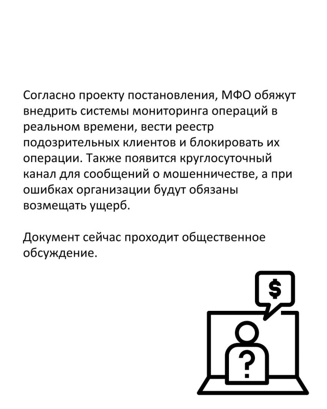 МФО должны будут разработать внутренние политики, внедрить системы автоматического мониторинга операций в режиме реального времени и вести реестр подозрительных клиентов с возможностью блокировки операций.