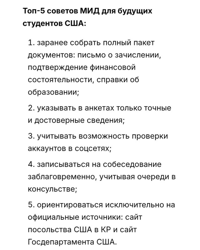 — Министерство иностранных дел Кыргызстана опубликовало разъяснения и рекомендации для граждан, которые планируют учебу в Соединенных Штатах Америки.