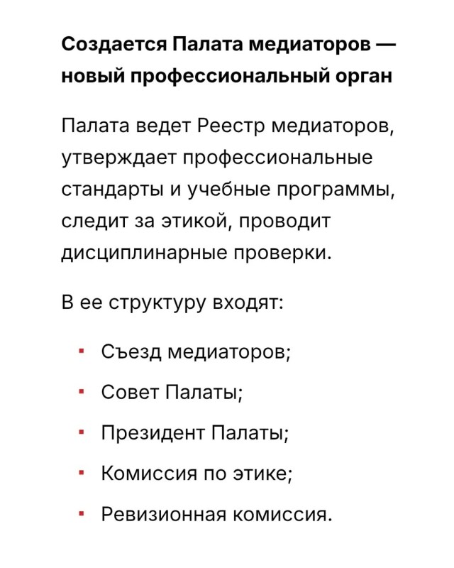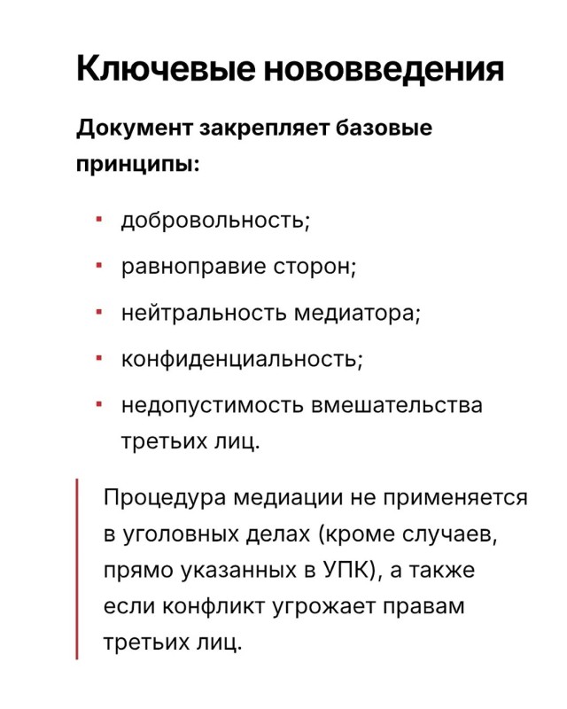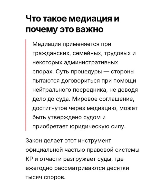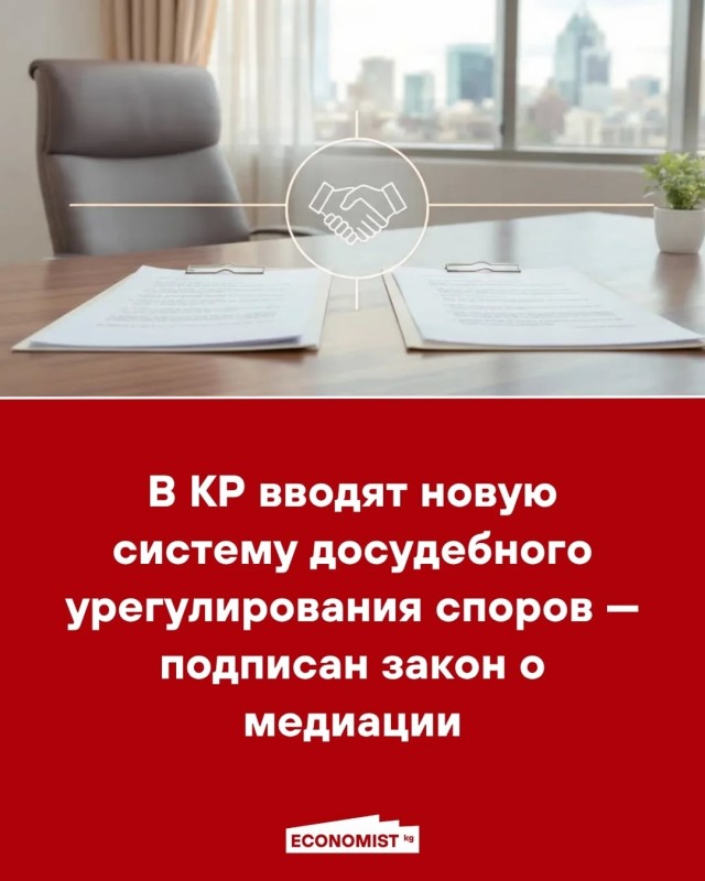 — Президент КР Садыр Жапаров подписал Закон «О медиации». Документ формирует в Кыргызстане полноценный правовой режим медиации — альтернативного способа урегулирования споров без суда.