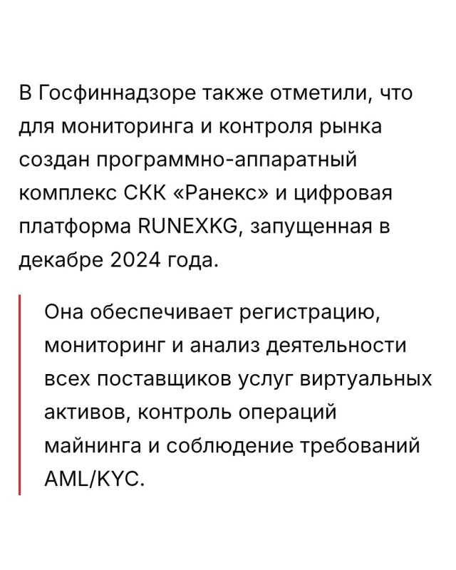 31 октября 2025 года Госфиннадзор зарегистрировал первый национальный стейблкоин USDKG, обеспеченный золотом: эмитировано 50 млн 140 тысяч 738 токенов с номиналом $1 каждый. Эмитент — ОАО «Эмитент виртуальных активов», учредителем которого выступает Минфин.