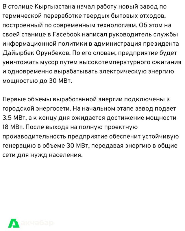 В столице Кыргызстана начал работу новый завод по термической переработке твердых бытовых отходов, построенный по современным технологиям. Об этом на своей станице в Facebook написал руководитель службы информационной политики в администрация президента Дайырбек Орунбеков. По его словам, предприятие будет уничтожать мусор путем высокотемпературного сжигания и одновременно вырабатывать электрическую энергию мощностью до 30 МВт.