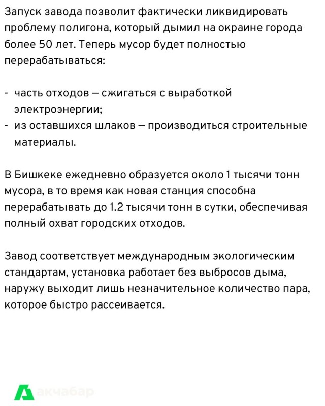 В Бишкеке ежедневно образуется около 1 тысячи тонн мусора, в то время как новая станция способна перерабатывать до 1.2 тысячи тонн в сутки, обеспечивая полный охват городских отходов.