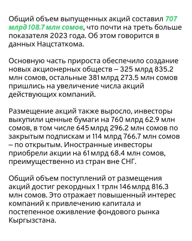 Общий объем выпущенных акций составил 707 млрд 108.7 млн сомов, что почти на треть больше показателя 2023 года. Об этом говорится в данных Нацстаткома.
