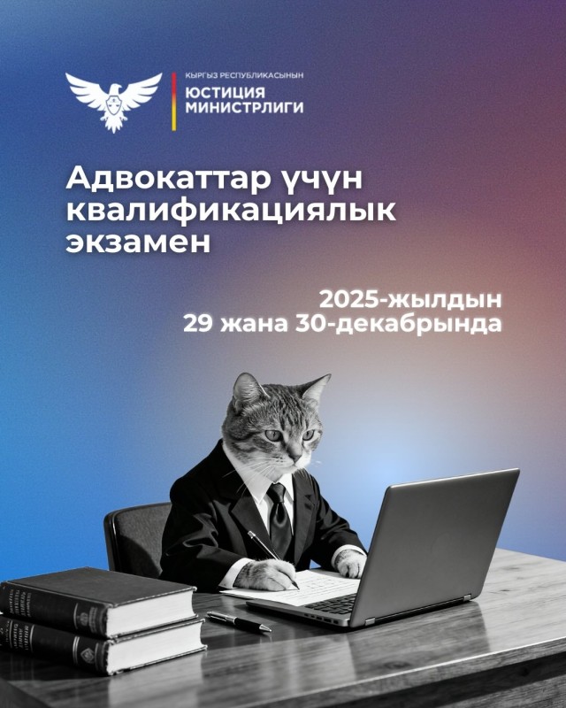 29 жана 30-декабрда боло турган адвокаттык иш жүргүзүү укугуна экзамендер жөнүндө маалымдайт.