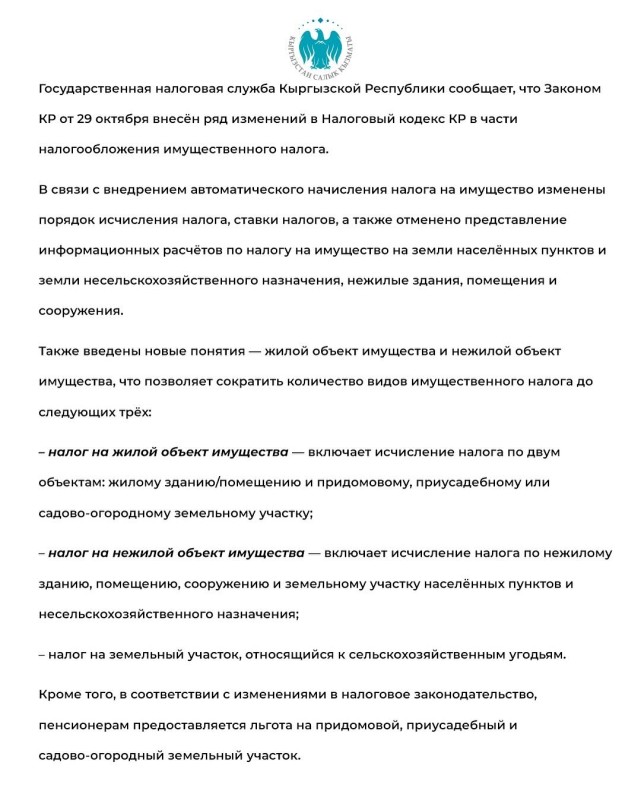 📑 Государственная налоговая служба Кыргызской Республики сообщает, что Законом КР от 29 октября внесён ряд изменений в Налоговый кодекс КР в части налогообложения имущественного налога.