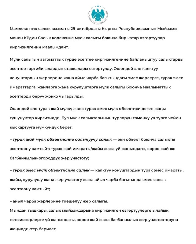 📑 Мамлекеттик салык кызматы 29-октябрдагы Кыргыз Республикасынын Мыйзамы менен КРдин Салык кодексине мүлк салыгы боюнча бир катар өзгөртүүлөр киргизилгенин маалымдайт.
