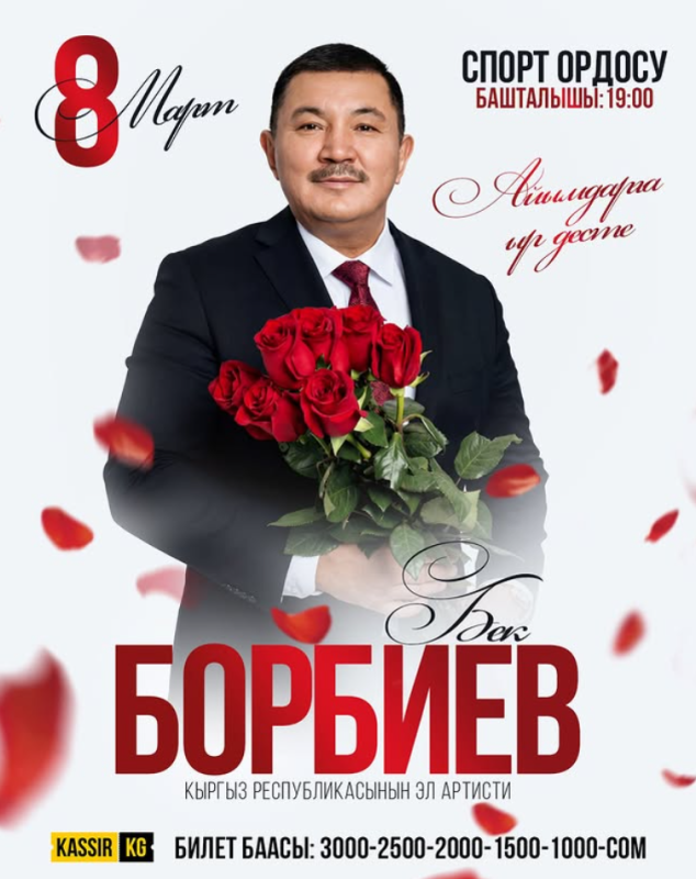 🌸 В честь Международного женского дня – 8 марта – на сцене Дворца спорта состоится специальный концерт народного артиста Кыргызской Республики Бека Борбиева.