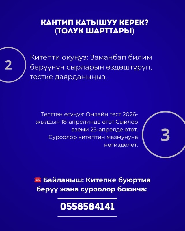 Онлайн тест 2026-жылдын 18-апрелинде өтөт. Суроолор китептин мазмунуна негизделет.