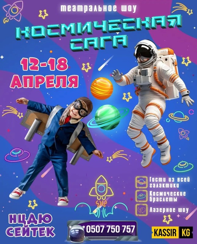 Ко дню Космонавтики с 12 по 18 Апреля в городе БИШКЕК, в НДЦЮ “СЕЙТЕК” состоится невероятная шоу программа «Космическая сага»
