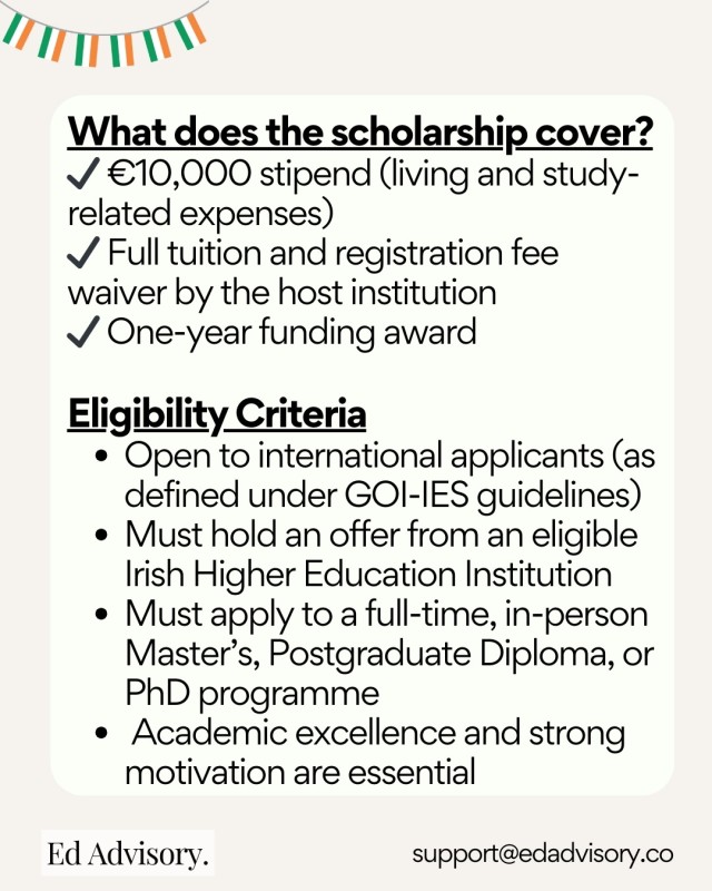 Ireland offers globally recognised degrees, strong research output, and access to Europe’s thriving tech, policy, and business ecosystem. The GOI-IES not only funds your studies but also positions you within Ireland’s international academic network.