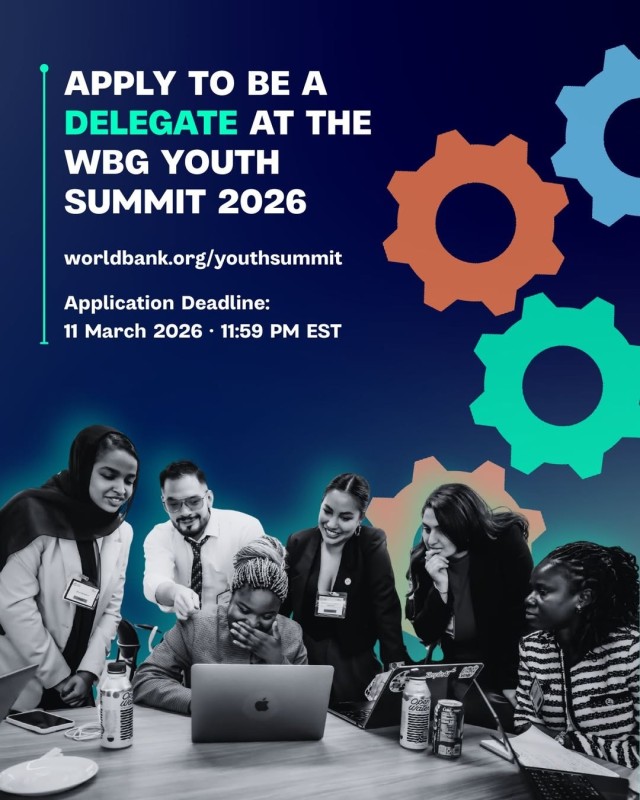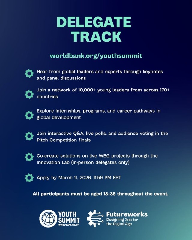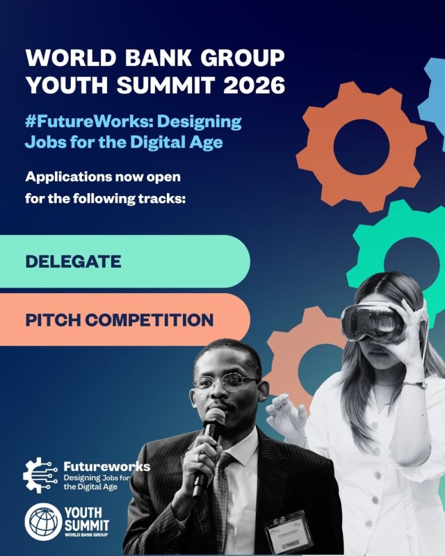 Young innovator or entrepreneur working on jobs, digital skills, education, agriculture, or inclusive growth? Apply now for the WBG Youth Summit 2026 (FutureWorks: Designing Jobs for the Digital Age).
