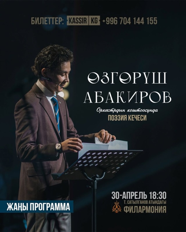🚩Сиздерди 30-апрель күнү саат 18:30да Токтогул Сатылганов атындагы улуттук филармониянын чоң залында боло турган кооз, коңур үнү менен акындардын ырларын жаңы өңүттө көркөм окуган Өзгөрүш АБАКИРОВдун ОРКЕСТР коштоосунда өтө турчу ЖАҢЫ ПРГОРАММАдагы поэзия (көркөм окуу) кечесине чакырабыз.
