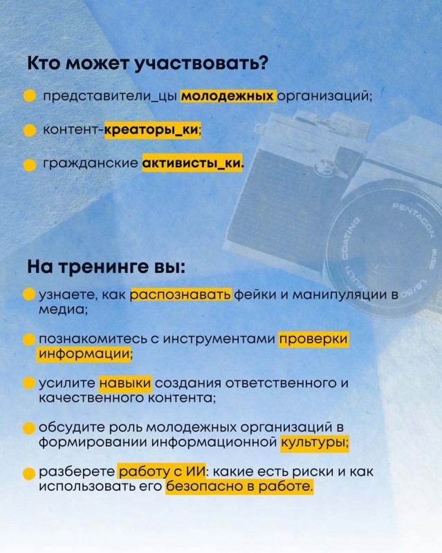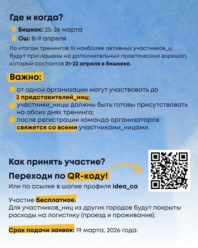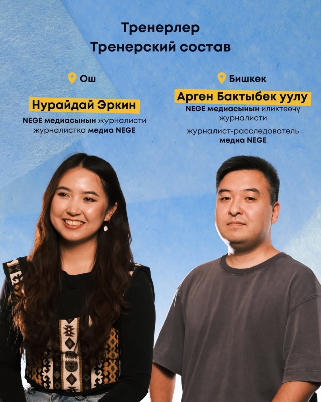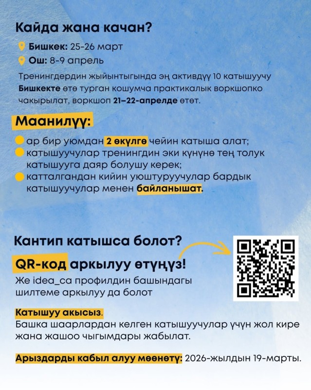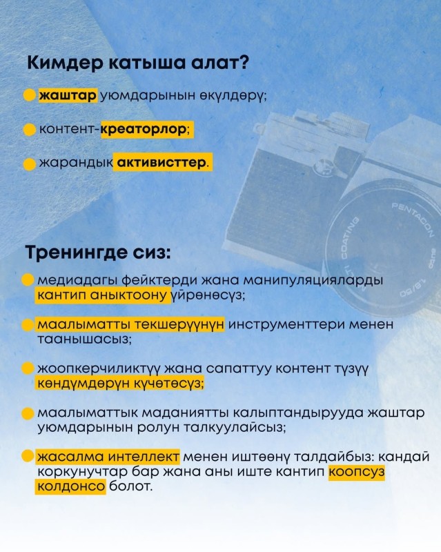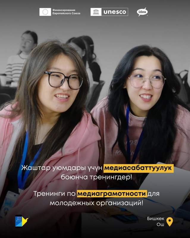 Биз уюмдардын өкүлдөрүн, жаш лидерлерди жана контент-креаторлорду Бишкек жана Ош шаарларында өтө турган медиа жана маалыматтык сабаттуулук боюнча эки күндүк тренингдерге жана воркшопко катышууга чакырабыз.