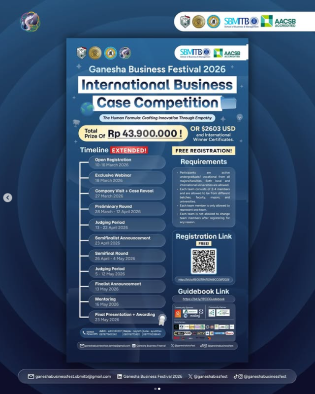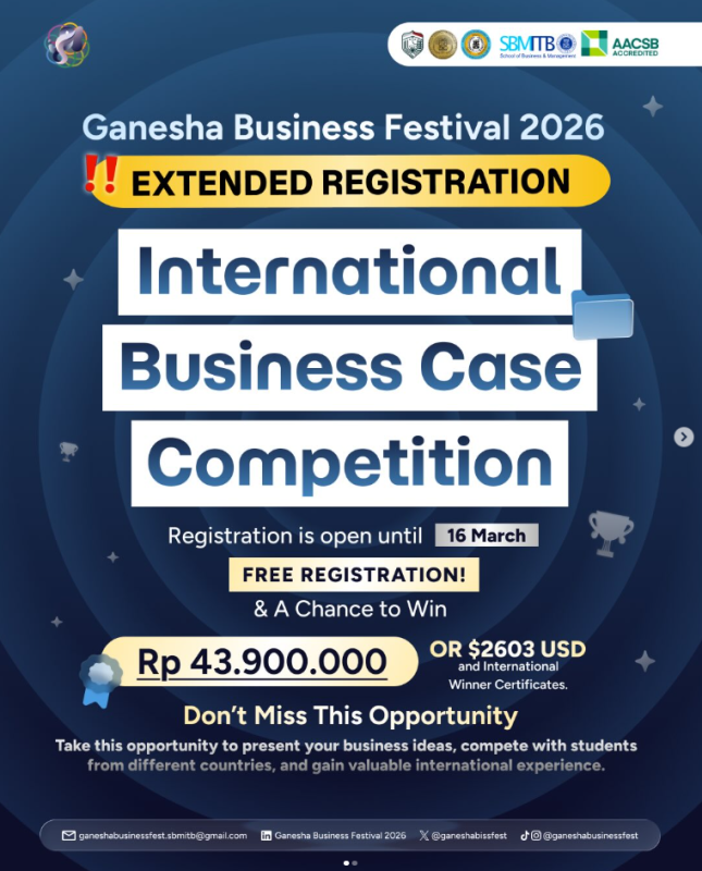 The registration for the International Business Case Competition (IBCC) 2026 at Ganesha Business Festival has been extended until 16 March.