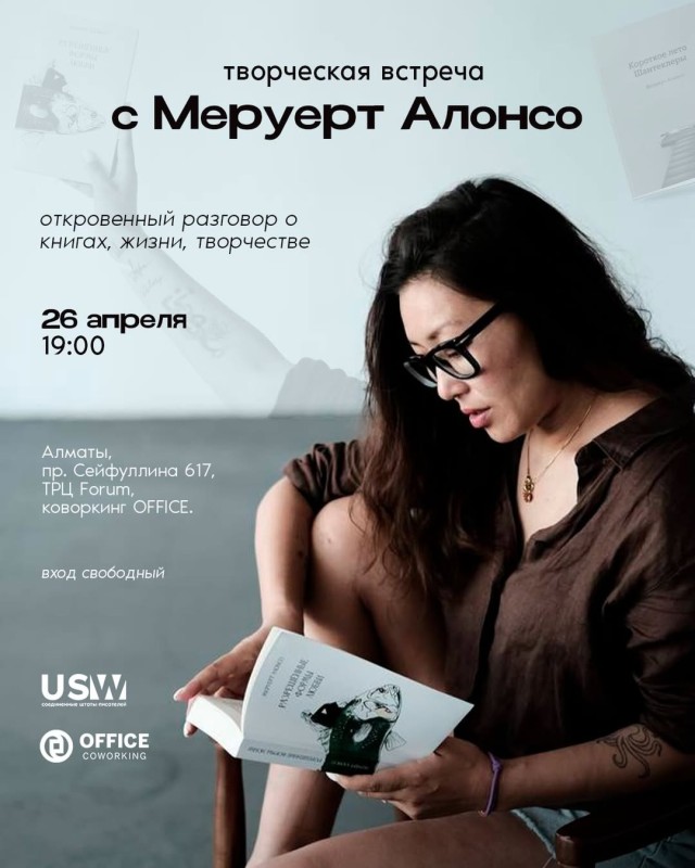 ▫️ Меруерт Алонсо — писательница, развивающий редактор и издатель, автор писательской лаборатории «Другой текст», основатель издательства Write and Publish, автор книжного клуба Room15, член Евразийской творческой гильдии, резидент USW и автор книг «Разрешённые формы любви», «Короткое лето Шантеклеры», «Приключения девочки Клоэ».