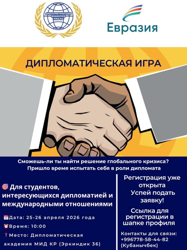 Дипломатическая академия Министерства иностранных дел Кыргызской Республики им. К.Дикамбаева и общественный фонд “Евразия Кей Джи” с радостью предоставляют Вам информацию о межвузовской симуляции «Гуманитарная дипломатия», которая состоится с *25 по 26* апреля 2026 года. Мероприятие проводится по мотивам престижного международного конкурса, посвящённого международному гуманитарному праву. Это уникальная площадка для отработки навыков дипломатических переговоров, анализа гуманитарных кризисов, представления позиции государства и поиска компромиссных решений в смоделированных международных ситуациях.