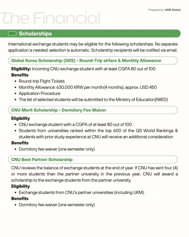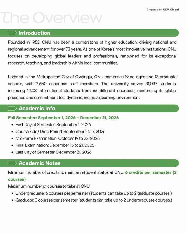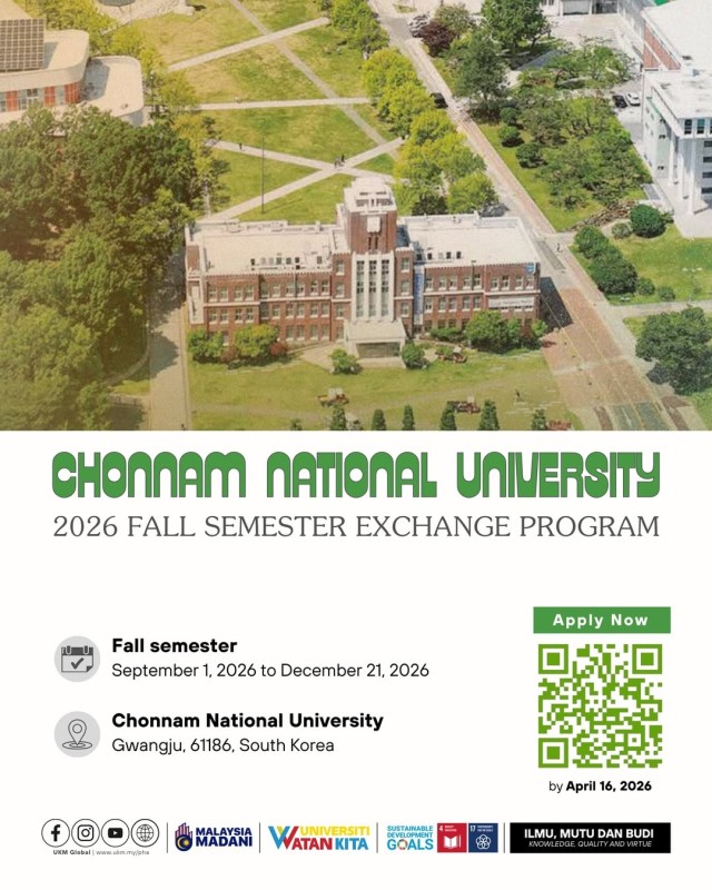 Applications are now open! UKM may nominate up to 5 students for the Fall 2026 semester or 2026–2027 academic year at Chonnam National University, Korea.