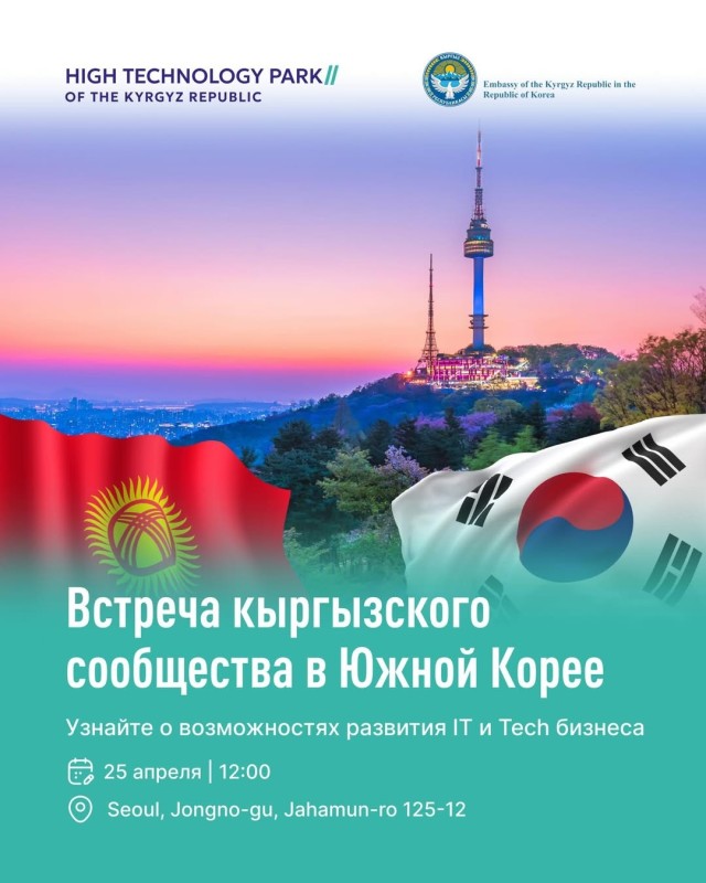 25 апреля в Сеуле команда Парка высоких технологий Кыргызской Республики расскажет, как соотечественники за рубежом могут включиться в развитие технологической экосистемы страны: запускать стартапы, открывать филиалы компаний, создавать рабочие места и привлекать инвестиции.