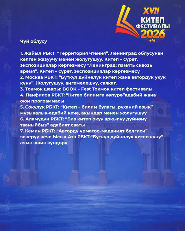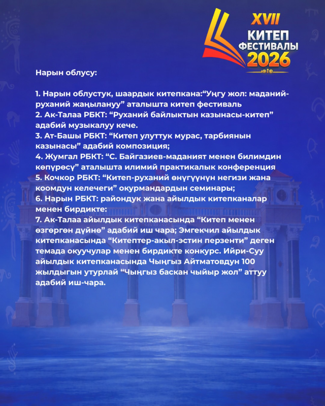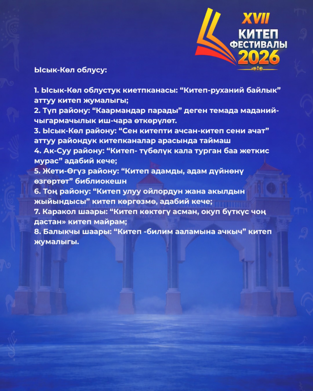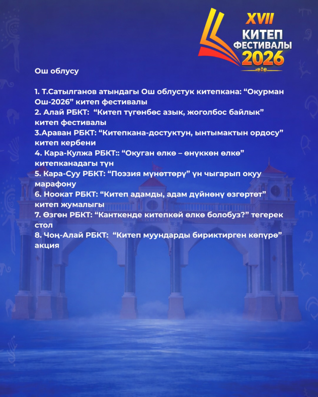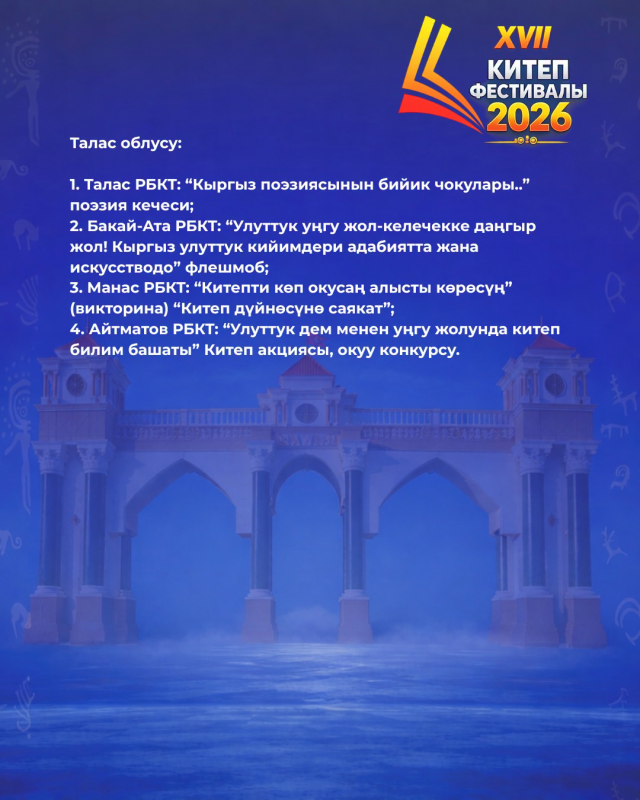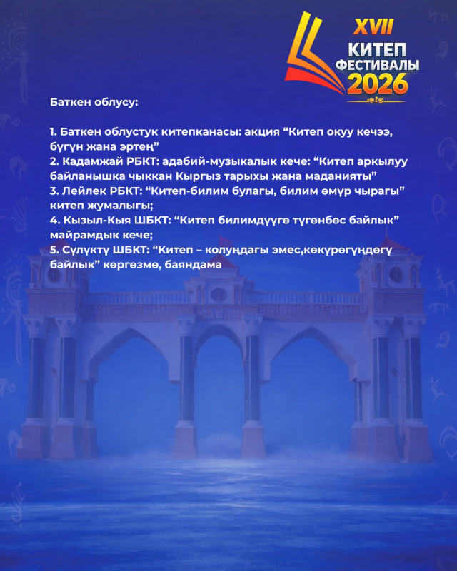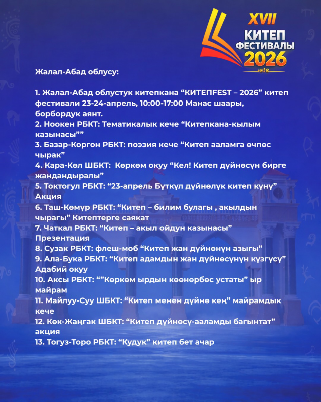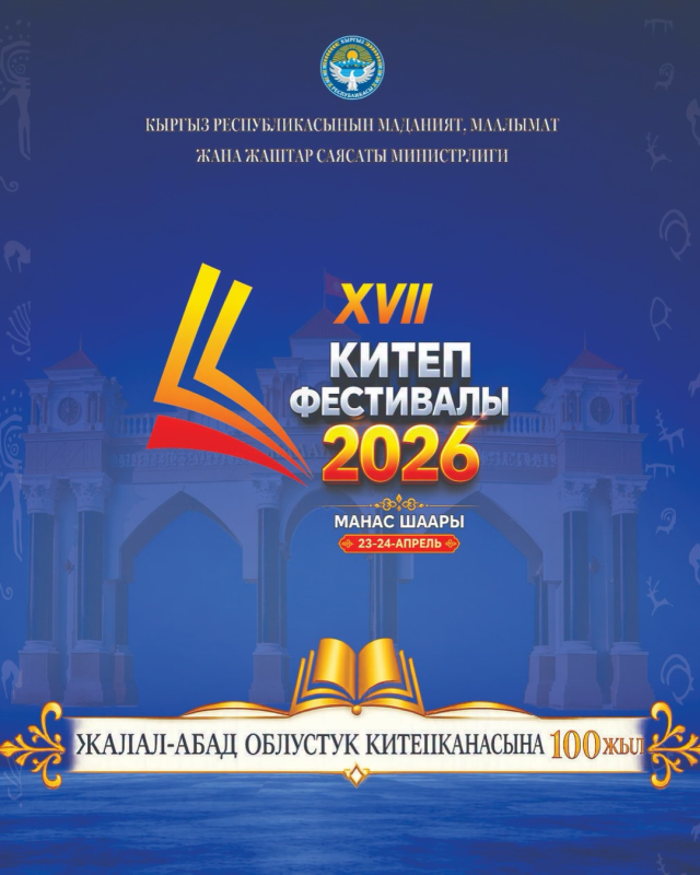 23–24-апрель күндөрү Жалал-Абад облусундагы Манас шаарында жыл сайын өткөрүлүп келе жаткан Эл аралык “XVII КИТЕП FEST – 2026” китеп фестивалы уюштурулат.