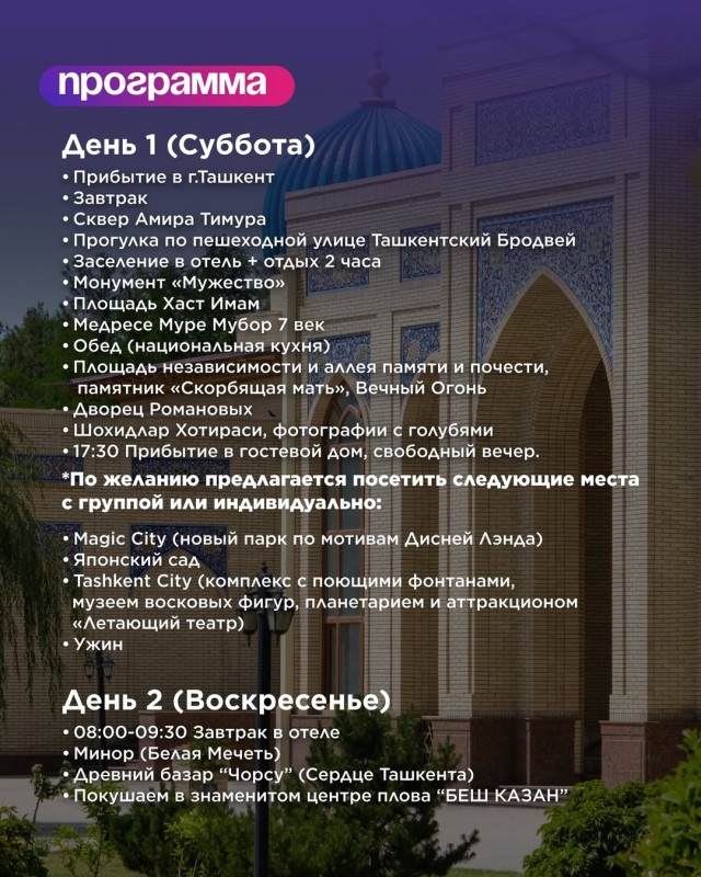 ⏺По желанию предлагается посетить следующие места с группой или индивидуально: